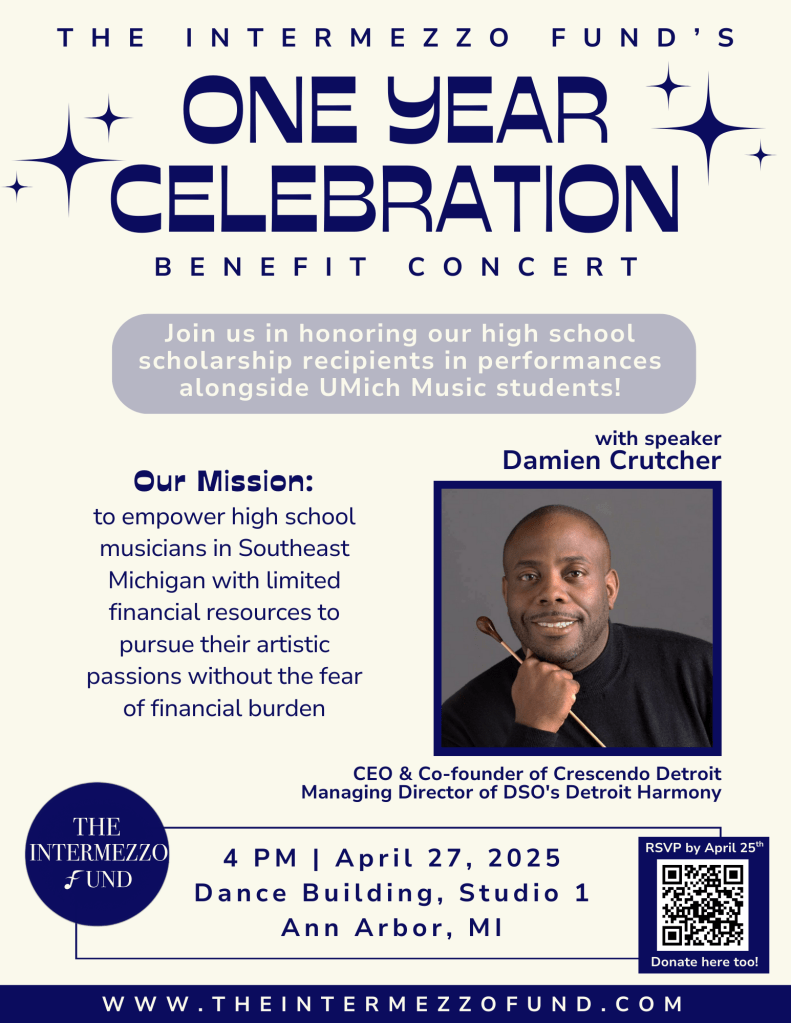 In April of 2025, we hosted our One Year Celebratory Benefit Concert in Ann Arbor! We presented the past year’s scholarship recipients, some of whom played alongside college music students at the University of Michigan. We also featured keynote speaker Damien Crutcher, CEO of Crescendo Detroit and Managing Director of the Detroit Symphony Orchestra’s Detroit Harmony.